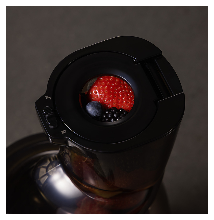 - Широкий диаметр загрузочного желоба позволяет загружать фрукты, овощи и ягоды целиком