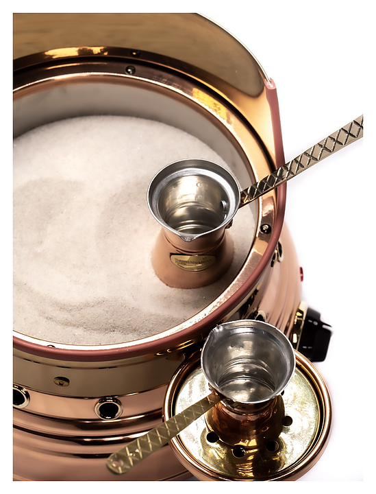 В комплект входят 1 джезва из меди и 1 мешочек со специальным песком.