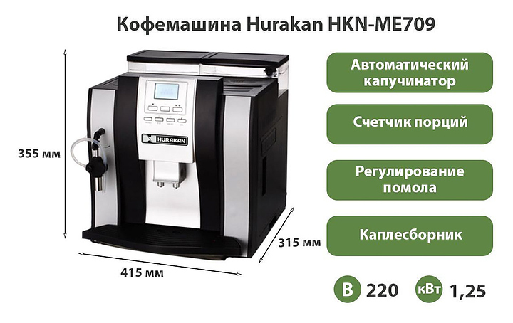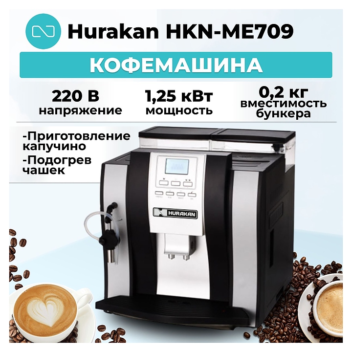Кофемашина Hurakan HKN-ME709 используется на предприятиях общественного питания и торговли. Модель оснащена электронным управлением, защитой от перегрева, возможностью подачи горячей воды и режимом очистки от накипи.