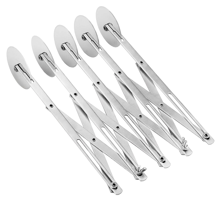 Нож P.L. Proff Cuisine 81240883 предназначен для резки теста на предприятиях общественного питания. Модель состоит из 5 односторонних раздвижных роликовых ножей. Изделие выполнено из нержавеющей стали.