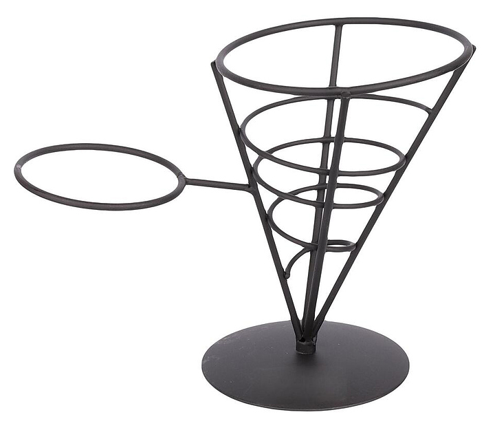 Корзинка P.L. Proff Cuisine 81200193 используется на предприятиях общественного питания для подачи картофеля фри, снеков, закусок, наггетсов и других аналогичных блюд. Емкость конической формы оснащена решетчатым бортом, устойчивым круглым основанием и подставкой для соусника. Изделие выполнено из металла.