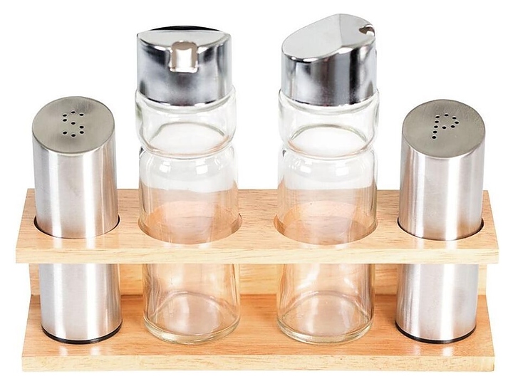 В набор входят солонка, перечница, 2 емкости для соусов и подставка.