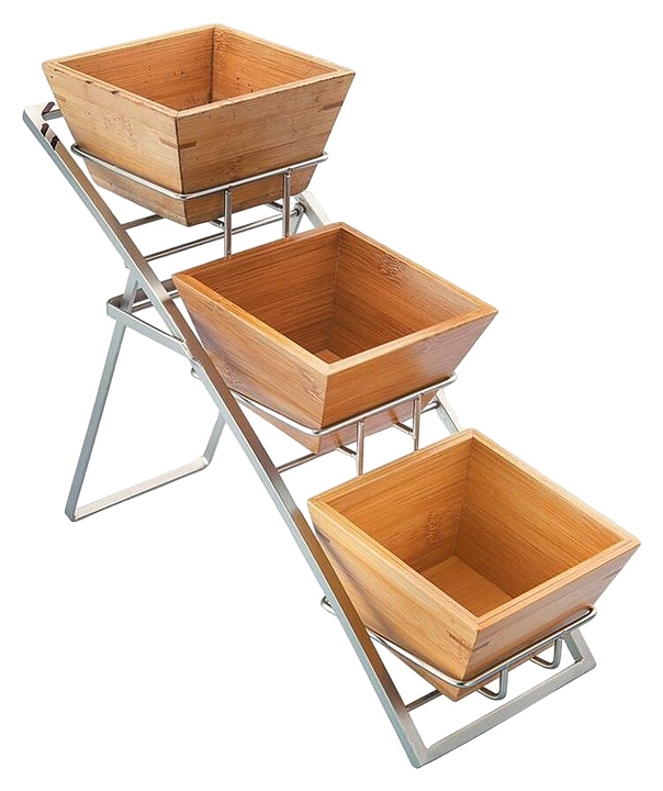 Фуршетная подставка P.L. Proff Cuisine 92000057 используется в процессе сервировки шведских столов, на банкетах и фуршетах для размещения хлебобулочных изделий. Модель имеет 3 яруса. Подставка выполнена из металла, блюда — из бамбука.