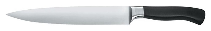 Поварской нож P.L. Proff Cuisine Elite 99000133 используется на предприятиях общественного питания и торговли, в частных домах и квартирах для нарезки продуктов. Лезвие изготовлено из кованной хромо-углеродистой стали, ручка — из высокопрочного сантопрена.