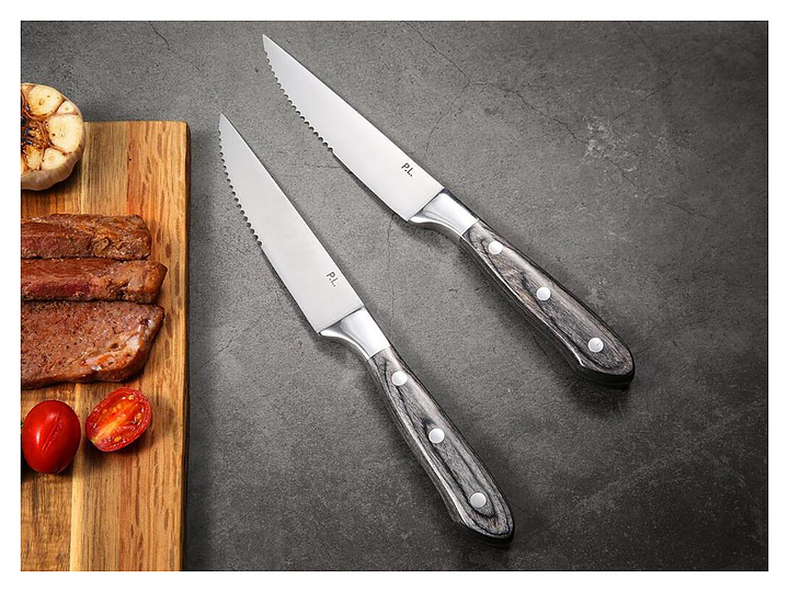 Нож для стейка P.L. Proff Cuisine Garwin 81280070 используется на предприятиях общественного питания. Модель можно мыть в посудомоечной машине. Лезвие выполнено из нержавеющей стали 3Cr13, которая отличается прочностью, долговечностью и устойчивостью к коррозии, ручка — из стали 18/0 и шпона дерева.