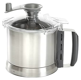 В комплект поставки входят чаша 3,7 л из нержавеющей стали и нож с мелкими зубчиками со съемным колпачком и инструмент для очистки ножа.