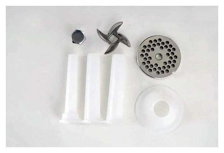В комплект поставки входят 2 ножа, 2 решетки диаметром 6 и 8 мм, загрузочный лоток и толкатель.