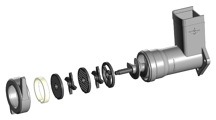 - Над загрузочным отверстием расположен несъёмный предохранитель, исключающий возможность попадания руки обслуживающего персонала к шнеку мясорубки