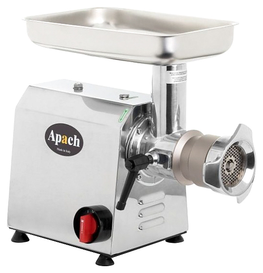 Мясорубка Apach ATI22UT серии Cook Line предназначена для измельчения мяса и рыбы в фарш, измельчения котлетной массы и набивки колбас на предприятиях общественного питания и торговли. Модель оснащена усиленным редуктором и вентилируемым асинхронным двигателем с защитой от перегрузок. Ножи, решетки, лоток и горловина выполнены из нержавеющей стали, мясорубочная часть и шнек — из пищевого чугуна, толкатель — из ABS пластика.