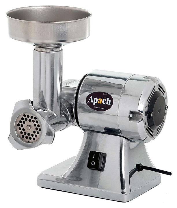 Мясорубка Apach ATS8 серии Cook Line предназначена для измельчения мяса, птицы и рыбы в фарш, измельчения котлетной массы и набивки колбас на предприятиях общественного питания и торговли. Модель оснащена вентилируемым асинхронным двигателем с защитой от перегрузок. Ножи, лоток, решетки и горловина выполнены из нержавеющей стали, мясорубочная часть и шнек — из пищевого алюминия, толкатель — из ABS пластика.