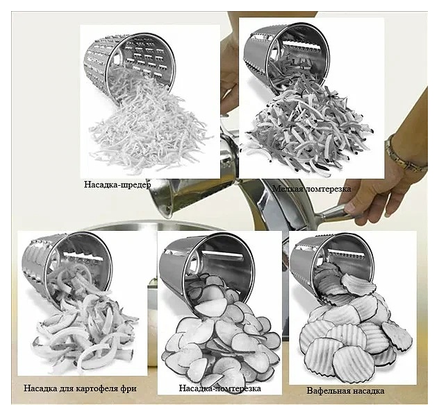 В комплект поставки входят 5 насадок: шредер, мелкая и крупная ломтерезки, терка для картофеля фри и вафельная насадка.