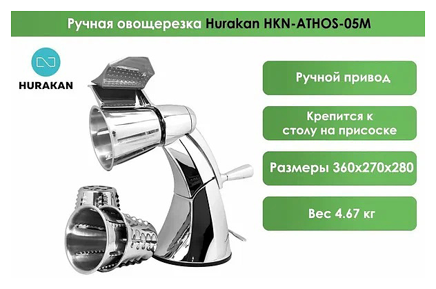 Овощерезка Hurakan HKN-ATHOS-05M используется на предприятиях общественного питания и торговли для нарезки сырых и вареных овощей, а также сыров, грибов, хлеба и других продуктов ломтиками и соломкой различного размера. Модель оснащена ручным приводом и крепится к столу мощной присоской. Корпус выполнен из алюминиевого сплава.