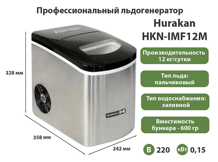 Льдогенератор Hurakan HKN-IMF12M используется на предприятиях общественного питания и торговли для приготовления пальчикового льда. Модель оснащена электромеханической системой управления. Корпус выполнен из нержавеющей стали.