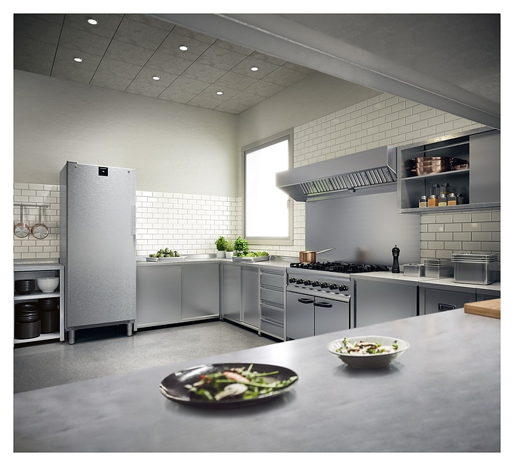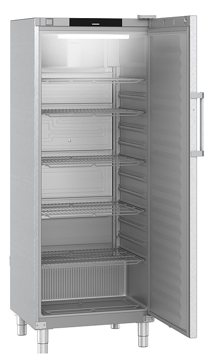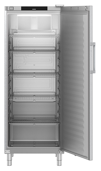 Холодильный шкаф Liebherr FRFCVG 6501 предназначен для охлаждения и кратковременного хранения скоропортящихся продуктов и напитков на предприятиях общественного питания и торговли. Модель оснащена электронным управлением и цифровой индикацией температуры. Корпус и ножки выполнены из нержавеющей стали, внутренняя часть — из серебристой пластмассы, ручка — из алюминия, покрытие решеток — из пластика.