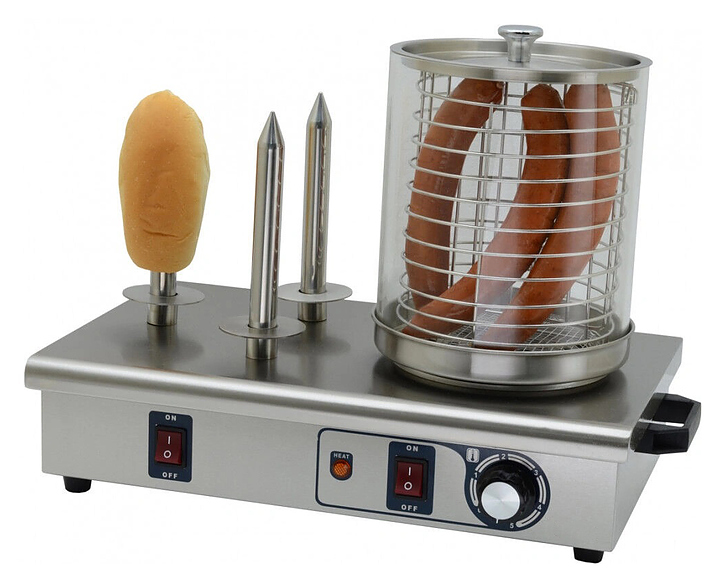 Аппарат для хот-догов Hurakan HKN-Y03 используется на предприятиях общественного питания и торговли для отваривания и хранения в горячем виде сосисок и подогрева булочек. Модель оснащена регулятором температуры, раздельным нагревом колбы и штырей, паровой баней и 3 нагреваемыми штырями. Корпус выполнен из нержавеющей стали и крашенного металла, штыри — из нержавеющей стали, колба — из стекла.
