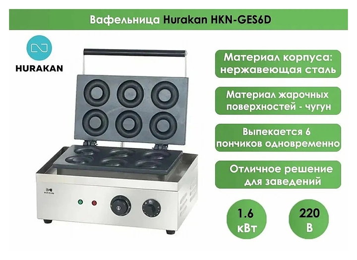 Аппарат Hurakan HKN-GES6D используется на предприятиях общественного питания и торговли для приготовления донатсов и пончиков. Модель оснащена эектромеханическим управлением, чугунными пресс-формами с 6 ячейками для пончиков. Корпус выполнен из нержавеющей стали, материал жарочной поверхности — чугун.