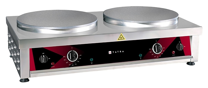 Блинница Tatra TCM S 40 D предназначена для выпечки блинов на предприятиях общественного питания и торговли. Модель оснащена электромеханической панелью управления с терморегулятором, системой независимого управления жарочными поверхностями и индикаторами питания и нагрева. Корпус выполнен из нержавеющей стали, жарочные поверхности имеют тефлоновое покрытие.