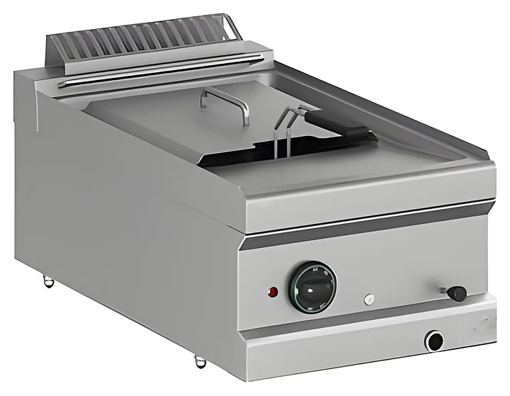 Фритюрница Apach APFE-47T/PL 700-й серии предназначена для приготовления блюд в масле на предприятиях общественного питания и торговли. Модель оснащена электромеханической панелью управления. Во фритюрнице предусмотрена холодная зона, что позволяет увеличить время использования масла. Корпус, ванна, рабочая поверхность, панель управления и вытяжная решетка выполнены из нержавеющей стали AISI 304, боковые и задняя панели — из нержавеющей стали AISI 430, корзина — из хромированной стальной проволоки, нагревательный элемент, фильтр и крышка корзины — из нержавеющей стали.
