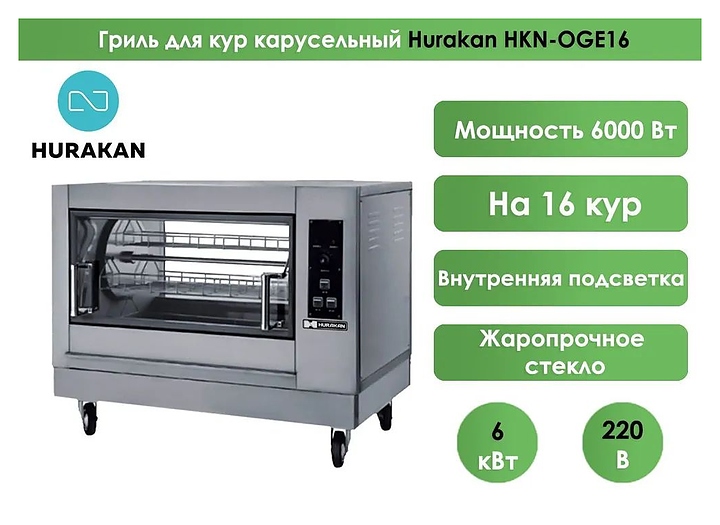 Гриль для кур Hurakan HKN-OGE16 используется на предприятиях общественного питания и торговли для зажаривания цыплят целиком, грудок, окорочков и других продуктов. Модель оснащена внутренней подсветкой и жаропрочным стеклом. Корпус выполнен из нержавеющей стали.