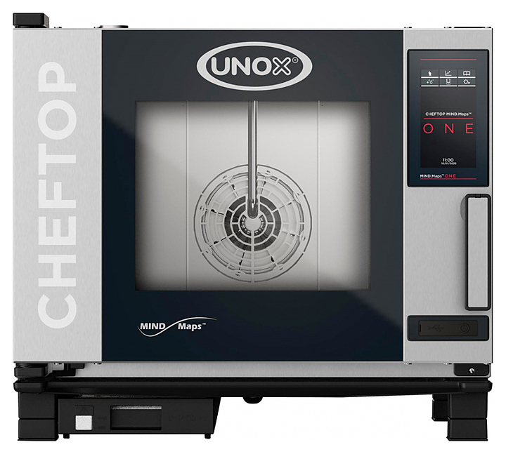 Пароконвектомат UNOX XEVC-0511-E1RM серии CHEFTOP MIND.Maps™ ONE предназначен для приготовления различных блюд, выпечки хлебобулочных и кондитерских изделий на предприятиях общественного питания и торговли, в пекарнях и кондитерских. Модель оснащена встроенной в дверь светодиодной LED-подсветкой и C-образными с зубчатыми нишами направляющими. Внутреннее открывающееся стекло облегчает чистку и обеспечивает максимальную гигиену. Камера с закругленными углами выполнена из нержавеющей стали AISI 304, направляющие — из профилированной стали, дверной замок — из высокопрочного самосмазывающегося технополимера, внутренний штифт дверной ручки — из углеродного волокна.