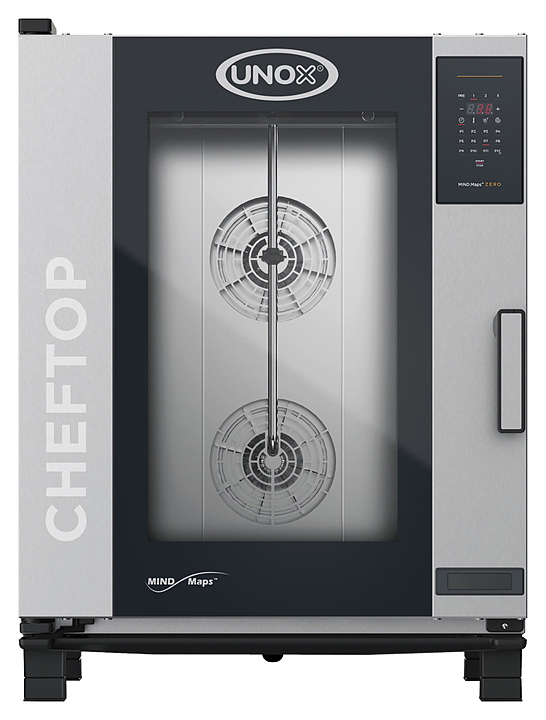 Пароконвектомат UNOX XEVC-1011-EZRM серии CHEFTOP MIND.Maps™ ZERO предназначен для приготовления различных блюд, выпечки хлебобулочных и кондитерских изделий на предприятиях общественного питания и торговли, в пекарнях и кондитерских. Модель оснащена встроенной в дверь светодиодной LED-подсветкой и C-образными с зубчатыми нишами направляющими. Внутреннее открывающееся стекло облегчает чистку и обеспечивает максимальную гигиену. Камера с закругленными углами выполнена из нержавеющей стали AISI 304, направляющие — из профилированной стали, дверной замок — из высокопрочного самосмазывающегося технополимера, внутренний штифт дверной ручки — из углеродного волокна.