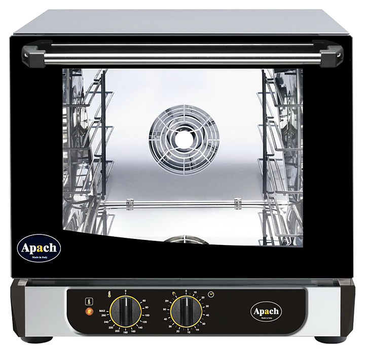 Конвекционная печь Apach AD44M ECO предназначена для выпекания или разогрева кондитерских и хлебобулочных изделий, различных блюд, замороженных или предварительно выдержанных в расстоечном шкафу заготовок из теста на предприятиях общественного питания и торговли. Подсветка камеры осуществляется галогеновой лампой. Корпус выполнен из нержавеющей стали, дверца — из двойного закаленного стекла.