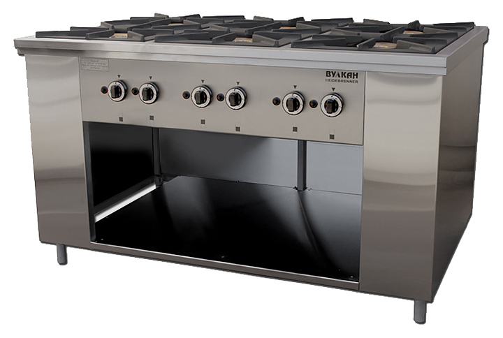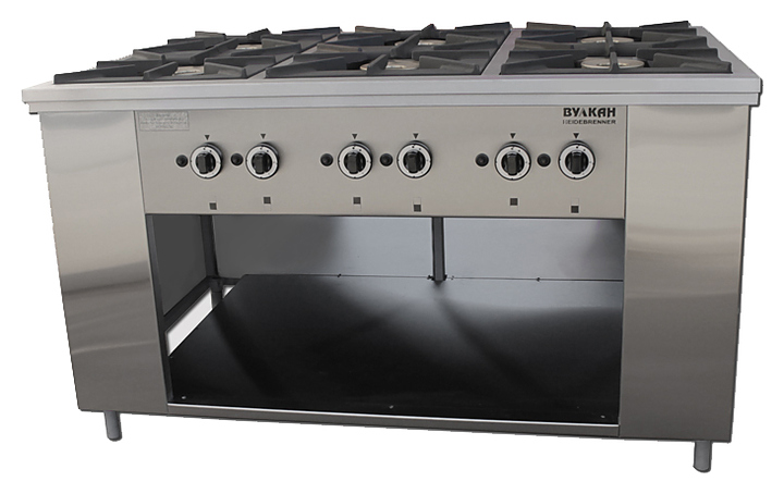 Газовая плита Вулкан ПРГ-IIA-6 Maxi предназначена для приготовления первых, вторых и третьих блюд в наплитной посуде на предприятиях общественного питания и торговли. Модель оснащена газ-контролем, пьезорозжигом и запальной горелкой. Корпус выполнен из нержавеющей стали, решетки — из чугуна, газовые горелки — из латуни.