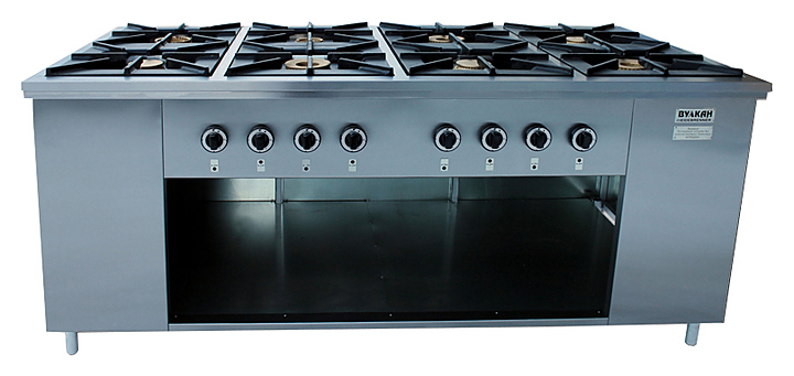 Газовая плита Вулкан ПРГ-IIA-8 Maxi предназначена для приготовления первых, вторых и третьих блюд в наплитной посуде на предприятиях общественного питания и торговли. Модель оснащена газ-контролем, пьезорозжигом и запальной горелкой. Корпус выполнен из нержавеющей стали, решетка — из чугуна, газовые горелки — из латуни.