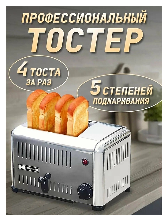 Тостер Hurakan HKN-TPT4 предназначен для подогрева и поджарки кусочков хлеба на предприятиях общественного питания и торговли. Модель оснащена таймером на 5 минут. Корпус выполнен из нержавеющей стали.
