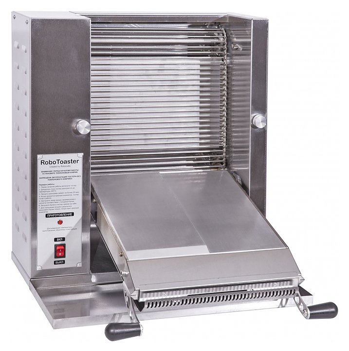 Конвейерный тостер ТТМ RoboToaster предназначен для подогрева и поджарки предварительно разрезанных булочек на предприятиях общественного питания и торговли. Модель оснащена электромеханическим управлением. Конструкция выполнена из нержавеющей стали AISI 430, нагревательная поверхность — из алюминия, контактная часть (коврик) — тефлон, сетчатая конвейерная лента — из нержавеющего прутка толщиной 4 мм.