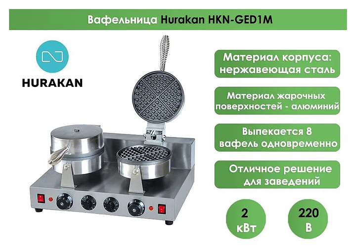 Вафельница Hurakan HKN-GED1M используется на предприятиях общественного питания и торговли для приготовления бельгийских вафель треугольной формы. Модель оснащена регулируемыми термостатами. Корпус выполнен из нержавеющей стали, рабочая поверхность — из чугуна с антипригарным покрытием.