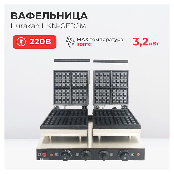 Вафельница Hurakan HKN-GED2M используется на предприятиях общественного питания и торговли для приготовления бельгийских вафель квадратной формы. Модель оснащена регулируемыми термостатами. Корпус выполнен из нержавеющей стали, рабочая поверхность — из чугуна.