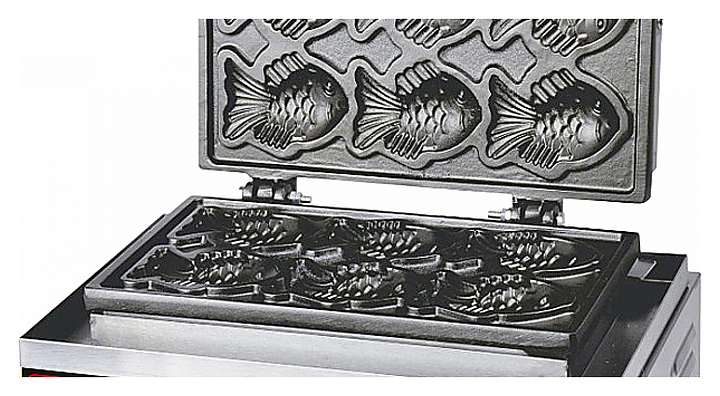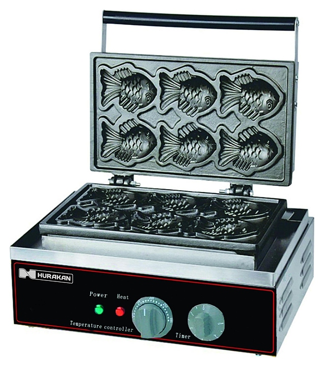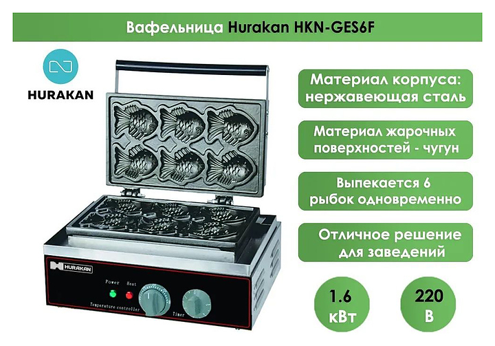 Вафельница Hurakan HKN-GES6F используется на предприятиях общественного питания и торговли для выпекания полых японских вафель тайяки в форме рыбок. Каждая вафля может быть наполнена начинкой. Модель оснащена регулируемым термостатом. Корпус выполнен из нержавеющей стали, рабочая поверхность — из чугуна.