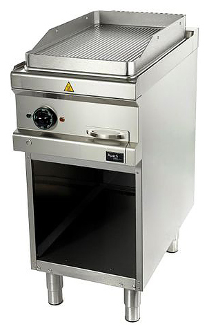 Жарочная поверхность Apach APTE-47PR/PL 700-й серии предназначена для обжарки мяса, рыбы и овощей на предприятиях общественного питания и торговли. Модель с закругленными краями и бортами оснащена электромеханической панелью управления с терморегулятором и 2 световыми индикаторами, выдвижным лотком для сбора остатков пищи, масла и жира и открытой подставкой с регулируемыми по высоте ножками. Корпус, панель управления и вытяжная решетка выполнены из нержавеющей стали AISI 304, боковые и задняя панели — из нержавеющей стали AISI 430, лоток — из нержавеющей стали, рабочая поверхность — из конструкционной стали.